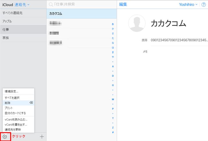 WebブラウザーでiCloud(https://www.icloud.com/)にサインインして、「連絡先」をクリックする。iCloudの連絡先は、3画面構成で、一番左にグループ、真ん中にそのグループに所属している人の名前(登録名)、一番右に電話番号などの細かい情報が表示されている。