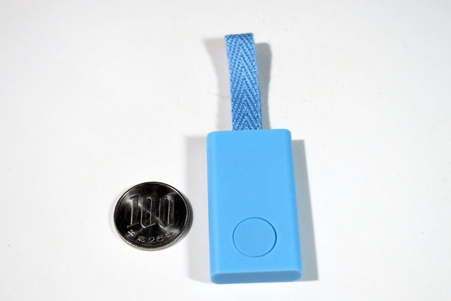 こちらがスマートタグ本体です。100円玉と比べると、その小ささがわかるかと思います