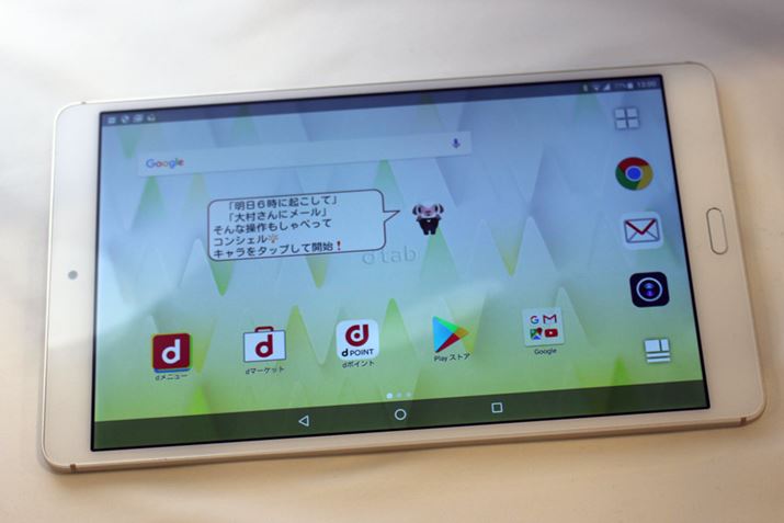 小型タブレットである「dtab Compact」が3世代目にリニューアルされた。新モデルは1600×2560のWQXGA表示に対応する約8.4インチの液晶ディスプレイを採用し、表示能力がアップ。CPUがオクタコアの「Kirin950」となり、RAMが3GBに増量されるなど、基本性能全般が底上げされている。実機の印象だが、質感のアップが目ざましい。従来のdtabシリーズは、低価格の割に質感が高いのがポイントだったが、本機はハイエンドタブレットのような緻密な質感と感触がある。またdtabシリーズとしては初の指紋認証センサーを備えているのも注目点だ。カラーバリエーションはゴールドとシルバーの2色。5月25日に発売される。