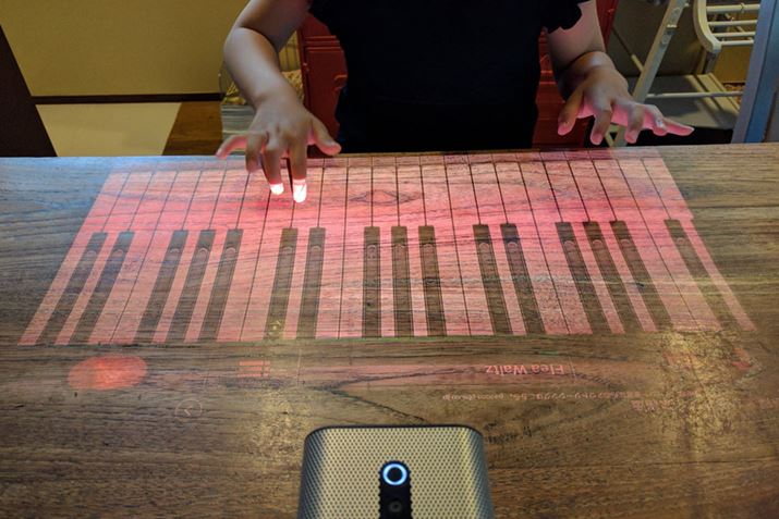 最大の特徴であるプロジェクターのタッチ操作であるが、10点までのマルチタッチに対応。タッチ操作は、本体に内蔵される赤外線センサーと専用カメラを組み合わせて、60fpsという高速スキャンで指の動きを検知する。そのため、タイムラグはほとんどなく、操作に違和感はない。なお、タッチ操作に対応するのは、最小投影サイズ23インチ表示のみで、それ以上の画面サイズになると、感度が低下して操作性が急激に落ちる。そのため、大画面で操作する場合は、別途Bluetoothキーボードなどを用意する必要がある。