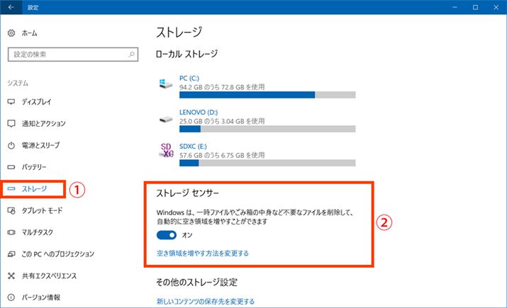 ウインドウ左側の「ストレージ」をクリックする。右側で「ストレージセンサー」のスイッチをクリックしてオンにする(1)。一時ファイルとごみ箱の中身を個別に設定する場合は「空き領域を増やす方法を変更する」をクリックする(2)