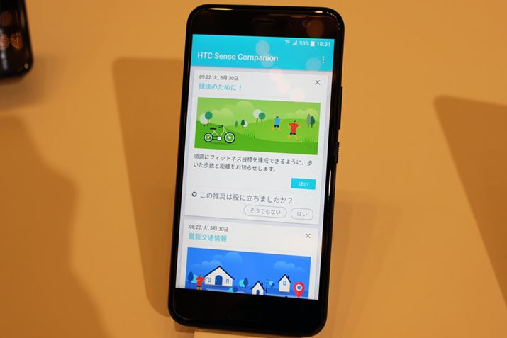 また、HTC独自のAI機能として「Sense Companion(センス・コンパニオン)」を搭載。ユーザーの利用状況を把握し、日々の行動やスケジュールを先取りしてアドバイスしてくれる。なお、Sense CompanionはAmazonの音声認識サービス「Amazon Alexa」にも対応する予定で、GoogleのAI機能「Google アシスタント」もプリインストールされる。また、バーチャルリアリティ(VR)機能として、専用のモバイルVRヘッドセット「LINK」(別売り)と接続することで、前後、上下、左右、およびそれぞれの軸回転である「6DoF」(Six Degrees of Freedom)のVR空間を体験できる。