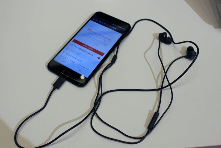 自動音響調節機能は、専用イヤホン「HTC U ソニック ハイレゾ」と組み合わせることで利用できる。なお、本機はヘッドホン端子が省略されているため、従来のヘッドホンは同梱のアダプターをUSB Type-Cポートに接続して使う