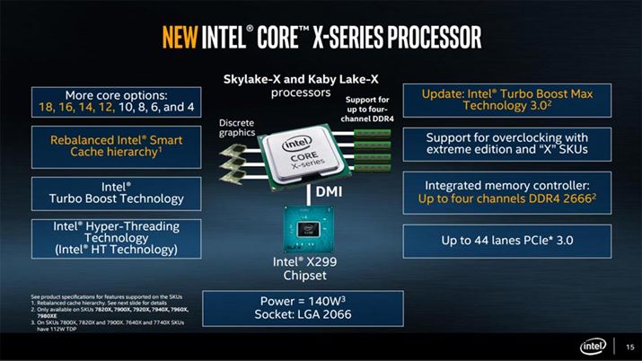 「Core X」シリーズは、既存の“Broadwell-E”を置き換えるハイエンドデスクトップ向けの新しいCPUシリーズだ。これまでコンシューマー向けに展開されていた「Core i」ブランドのCPUは、Core i7/i5/i3の全部で3つのグレードのみだったが、今回初めて「Core i9」を冠した製品をラインアップ。最上位モデルとなる「Core i9 7980X Extreme Edition」は、同社コンシューマー向けCPUで初となる18コア36スレッドを実現したという。