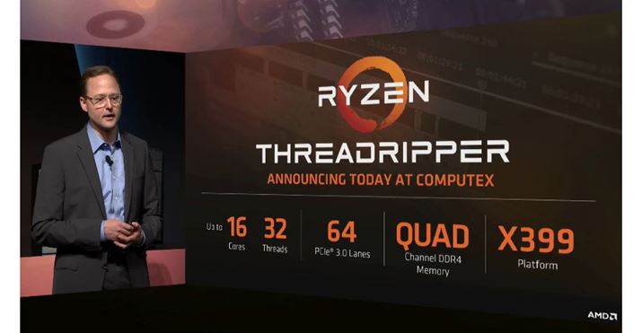 ハイエンドデスクトップPC向けのCPUモデル「Ryzen Threadripper」は、PCI Expressを64レーンもサポートするという(画像はAMD公式Twitterより)