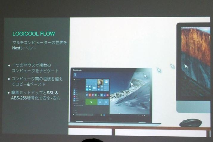 新機能のロジクールFLOWは、ハードウェアとソフトウェアを組み合わせにより実現。ネットワークを介して、異なるコンピューター間をシームレスに移動できるのが特徴だ