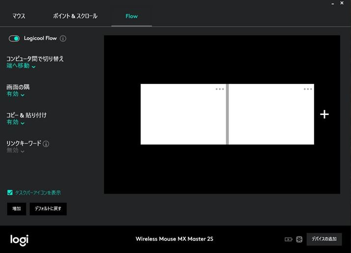 ロジクールFLOWの設定画面。マルチウィンドウの設定のように、コンピューターの画面の並び順などを指定できるほか、コピー&ペースト機能のON/OFFなどをコントロールできる