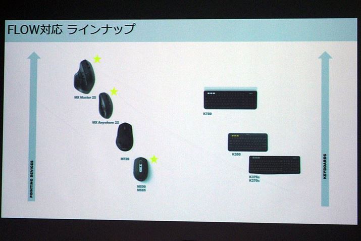 ロジクールFLOW対応デバイスの一覧。今回発表されたMXシリーズのマウスのほか、ミッドレンジのマウス2モデル、キーボード4モデルが対応する