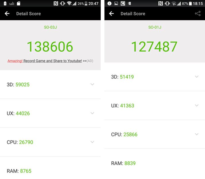 Xperia XZs(左)の総合スコアは138,606で、Xperia XZ(右)の総合スコアは127,487。両機には11,000程度のスコア差が出た