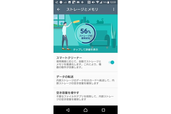 近ごろのXperiaシリーズではおなじみの、RAMとストレージを最適化する「スマートクリーナー」を本機も搭載。4GBの大容量RAMと組み合わせて使えば、RAMの空き容量不足に悩まされずに快適に使い続けられるだろう