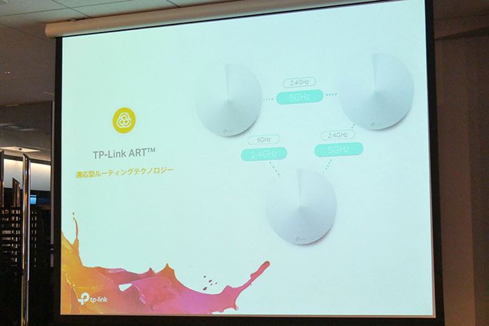 独自のメッシュネットワーク技術の中心を成す「TP-Link ART」。最適な接続経路の割り出し、使用する周波数帯域の決定、ユニット間のローミング、通信障害発生時の迂回、収容台数の分散などを行っているという。なお、これらの通信環境の管理はIEEE 802.11kやIEEE 802.11vを利用しており、最近のパソコンだけでなく、AndroidデバイスやiOSならほぼ対応しているという
