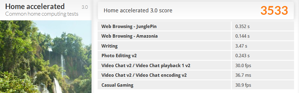 PC MARK 8の結果はHome acceleratedで「3533」と、普段使いのノートPCとしても活躍できるスコアとなった