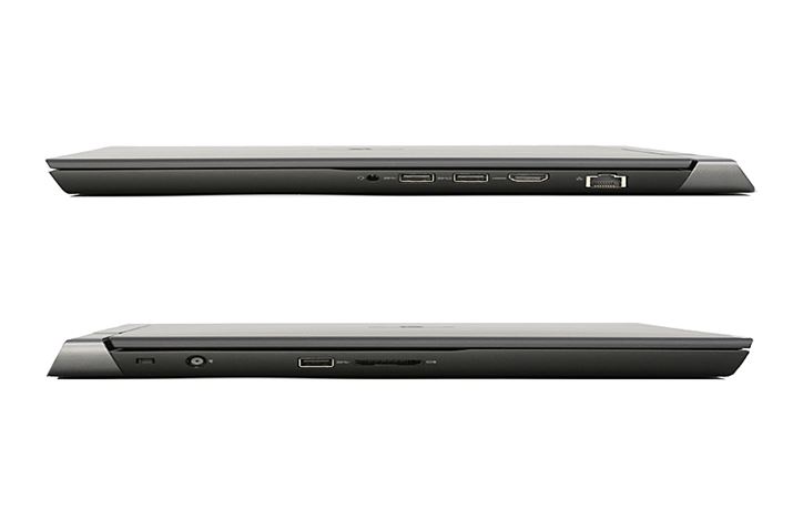 インターフェイスは、左側面に電源コネクター、USB 3.0ポート、SDカードスロットが、右側面にLANポート、HDMIポート、USB 3.0 ポート×2、コンボジャック(ヘッドセット/マイク)を備えており、基本的なインターフェイスは揃っている。なお、光学ドライブは搭載されないなど、割り切った仕様となっている。