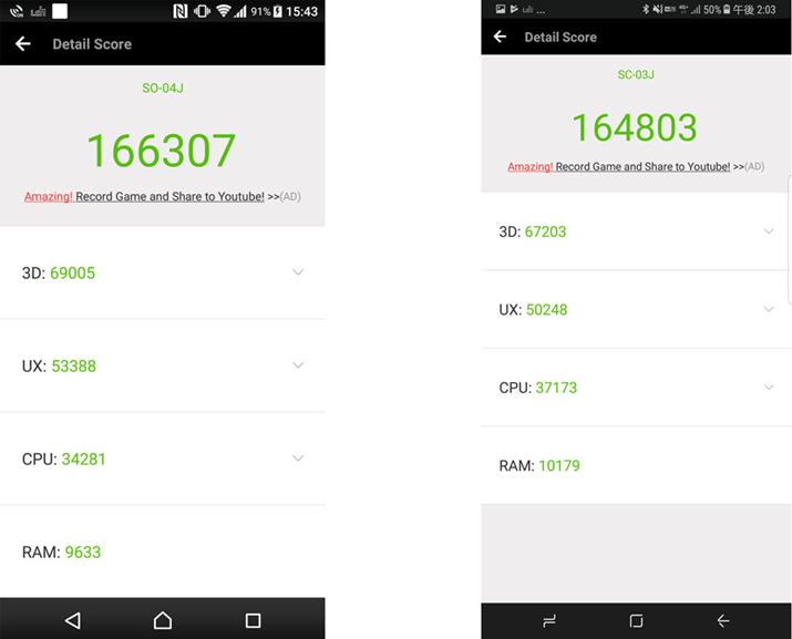 Antutuベンチマークの総合スコア。左がXperia XZ Premium、右がGalaxy S8+のもの。画面解像度やCPUの仕様が少し異なるが、スコアの違いはほとんどなく、Xperia XZ Premiumのほうがやや高いレベル