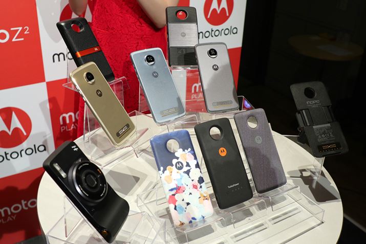 写真中央が今回発表されたMoto Z2 Play。手前は張モジュール、Moto Modsの新モデル。左は光学10倍ズームレンズを搭載する「ハッセルブラッドTRUEZOOM」(発売済み)