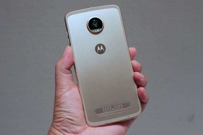 ファインゴールドモデル。背面下にMoto Modsとの接続に利用する端子を備える。カメラ部分は張り出しているが、Moto Modsを装着することで目立たなくなる仕組みだ