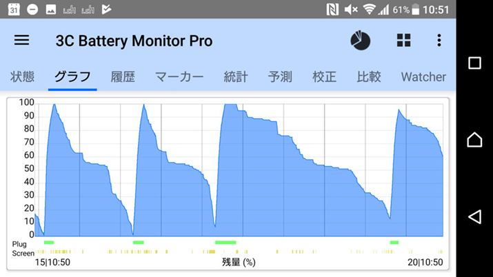 7日間の検証期間中、直近5日間のバッテリー消費のペースを記録したもの。7日間の使用で充電は4回行った。待ち受けが多い場合バッテリーの消費はかなりゆるやか。筆者の利用ペースなら普通に使っても、1〜2日は持続する