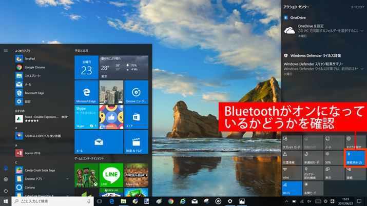 まずパソコンとスマートフォンのBluetoothがどちらもオンになっていることを確認する。次にアクションセンターやスタートメニューで「設定」をクリックして開く