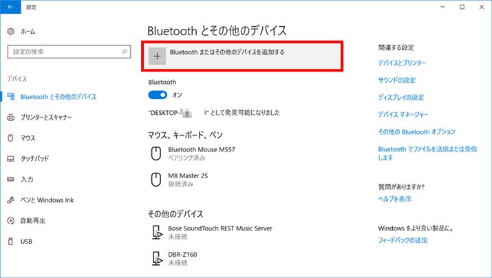 スマートフォンをすでにペアリング済みなら「その他のデバイス」に表示されている。まだペアリングしていない場合は「Bluetoothまたはその他のデバイスを追加する」をクリックする
