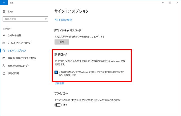 ウインドウ左側で「サインインオプション」をクリック。画面右側を下方向にスクロールして、「動的ロック」の項目にある「その場にいないことをWindowsで検出して〜」にチェックを入れて設定は完了。機能をオフにするには、「動的ロック」の項目にある「その場にいないことをWindowsで検出して〜」を再びクリックしてチェックを外せばいい