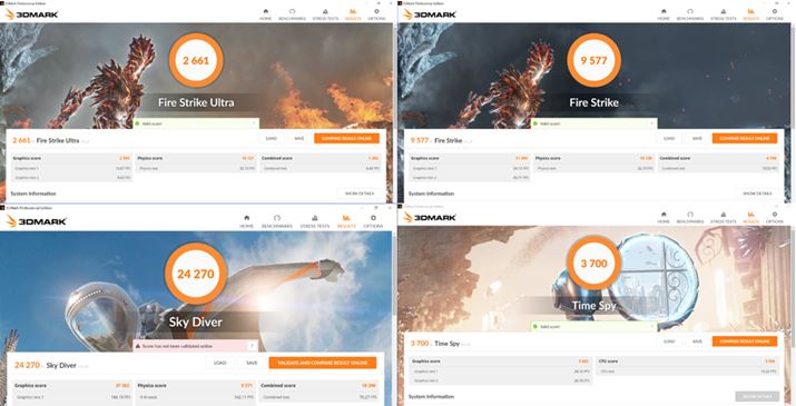 定番のFuturemark「3DMark」(一部)の結果。DirectX11とフルHD環境での性能を測る「Fire Strike」(右上)のスコアは9577と上々の結果だ