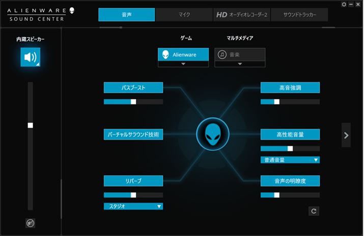 内蔵スピーカーの音は不満のないレベルだが、ヘッドホンを使えばバーチャルサラウンドで、より立体感のある音を楽しめる。画像は音質調整ツールの「ALIENWARE SOUND CENTER」