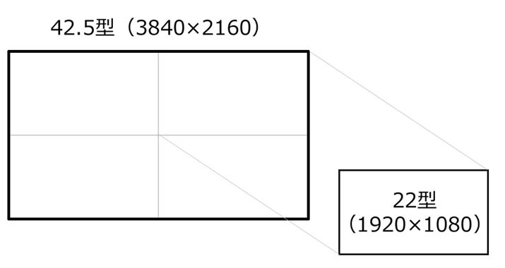 43型4Kモデルと22型フルHDモデルは画素密度が近いので、表示スケールもほぼ一緒。慣れ親しんだ感覚で見れるうえ作業領域も大きく広がる