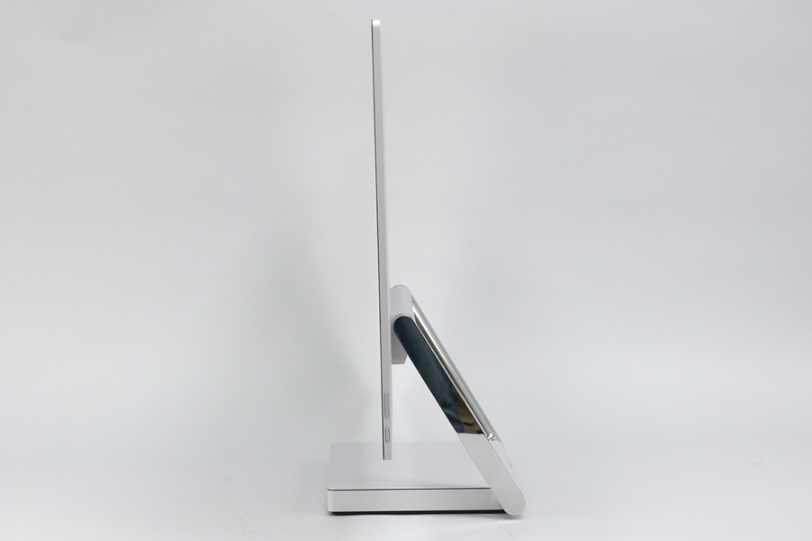 この大きくて美麗なディスプレイは、液晶ペンタブレットのように倒して使うことが可能だ。台座部分とディスプレイは、「ゼログラビティヒンジ」と名付けられた2本のヒンジでつながっており、軽い力で倒したり、起こしたりできる。大きさからは考えられないほど、本当に軽い力で動かせるのに驚かされた。さらに、台座底の4つのゴム足には摩擦を抑える表面処理が施されており、軽い力で回転できる。よく観察すると、手前の右側のゴム足を軸にして回転しているようだ。台座の背面に外部インターフェイスが備わっているのだが、軽い力で回転させることができるので、周辺機器の抜き差しにはそれほど苦労せずに済みそうだ。