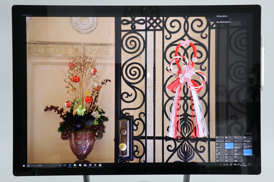 画質については、DCP-P3、sRGB、鮮やか(Vivid)という3つのカラープロファイルが用意されており、「アクションセンター」や「設定」から変更できる。DCP-P3は、sRGBより25%多くの色を再現できる規格で、同社ではデジタル映画コンテンツを作成するときなどに最適としているが、写真や動画もキレイに表示できるので日常使いしてもよさそうだ。sRGBが用意されているのは、sRGBしか表示できない環境でどのように表示されるかを確認するときのため。推奨既定モードの鮮やかは、DCP-P3よりも暗い部分が明るく持ち上げられている印象で、映画やゲームなどに向いている。