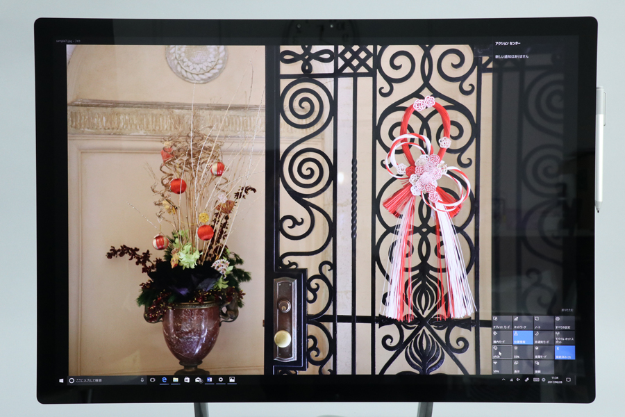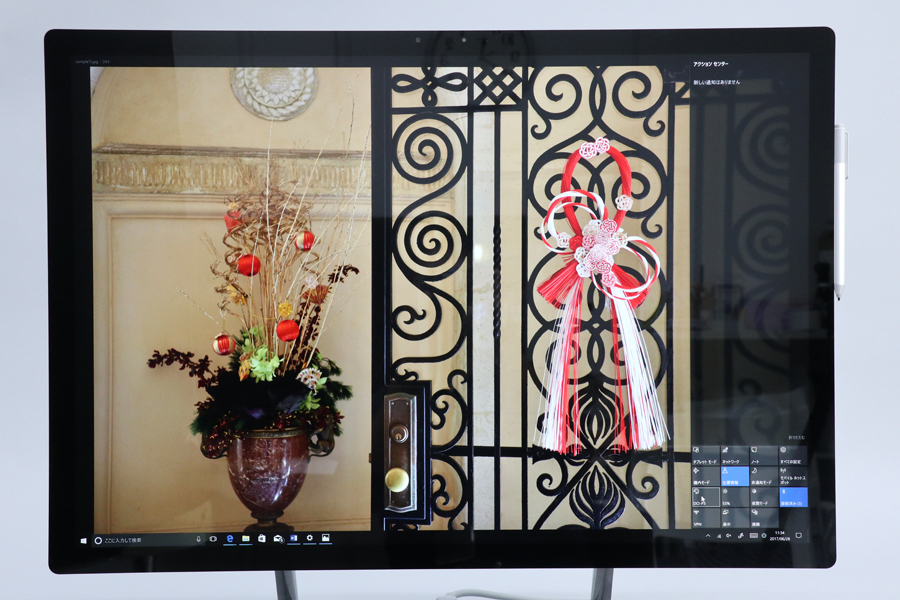 ディスプレイを一番深くまで倒した「スタジオモード」は、付属の「Surface ペン」を使って絵をかいたりするときに便利なモードだ。パームリジェクションも備わっており、画面に手をつきながらでも問題なく書き込める。なお、Surface Studioに付属するSurface ペンは、筆圧検知が1026段階の旧型となる。新しい「Surface Pro」のSurface ペンは、4096段階の筆圧検知と傾き検知をサポートするので、スペックは劣る。メモや趣味程度のイラストであれば問題はないが、プロのイラストレーターは、新しいSurface ペンのほうがうれしかったはずだ。