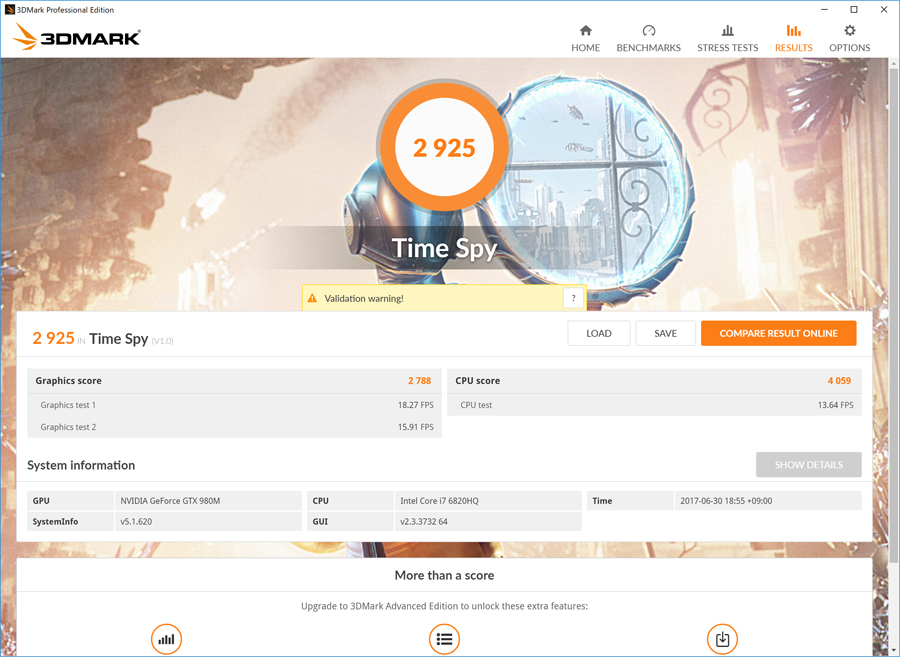 Futuremark「3DMark」の「Time Spy」の結果は2925