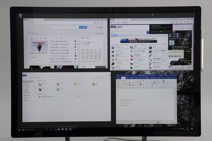 Surface Studioはクリエイター向けの一体型デスクトップ。最大の特徴は、大きなディスプレイだ。4Kを超える4500×3000という高解像度な28型液晶ディスプレイを搭載する。画面サイズは実測で横が約60cm、縦が約40cm。大きいだけでなく、ほかの「Surface」シリーズと同じ、縦横比が3:2のディスプレイなので、複数のウィンドウを開いて作業するときに便利だ。