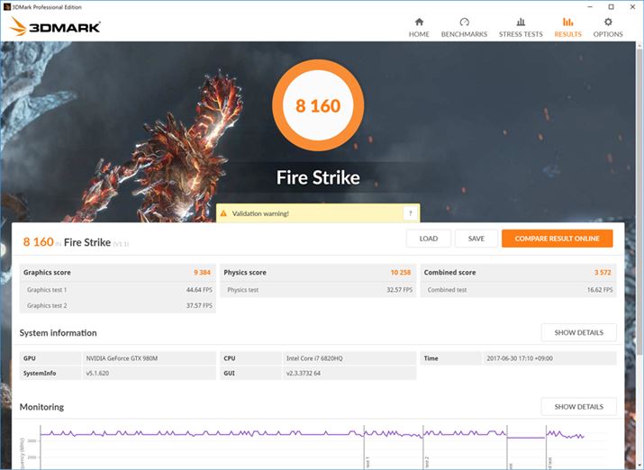 Futuremark「3DMark」の「Fire Strike」の結果。最新のヘビーなゲームは別として、解像度を落とせば多くのゲームが楽しめそうだ