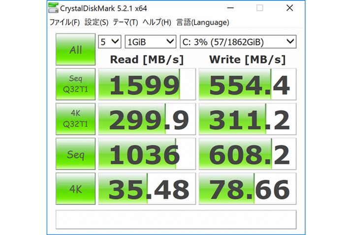ストレージの読み書きの速度を測れる「CrystalDiskMark 5.2.1 x64」(ひよひよ氏作)の結果。NVMeのSSDが効いており、読み書きともに高速だ