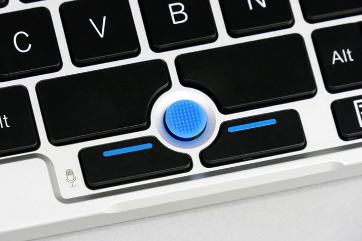 トラックポイントの上にあるのがスペースキーで、下にあるのが左クリックと右クリックに対応するキー。キーなので、クリックしたときに「カチカチ」という音は鳴りません。トラックポイントと周囲のキーが非常に近く、親指でトラックポイントを操作するのはかなり無理があると感じました