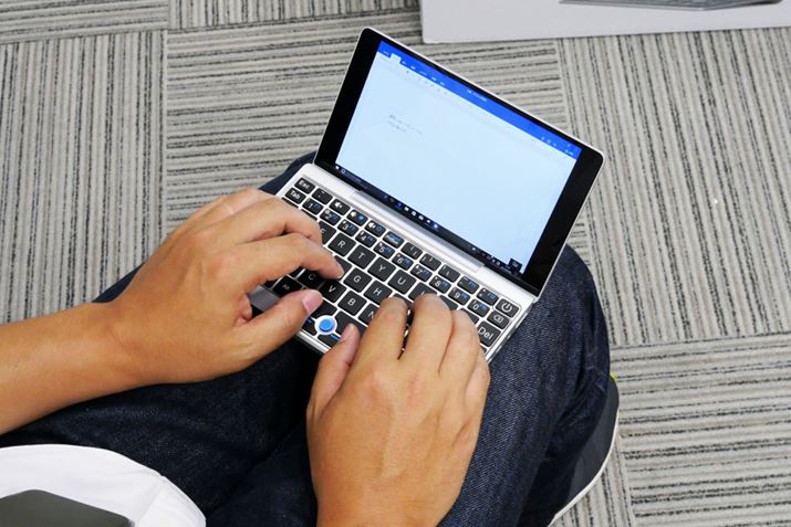 ポケットサイズなのでひざの上での作業も行えます。ただし、目とディスプレイの距離が遠く、ディスプレイをのぞき込むような体勢になるため、長時間作業していると首に負担がかかります