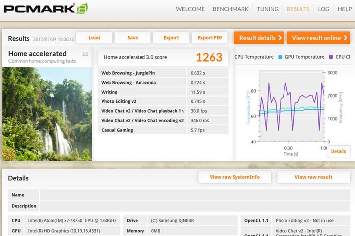 パソコンの総合性能を測れるベンチマークソフト「PCMark 8」のスコアは1263(Home accelerated)。決して高くないスコアですが、文書作成やWebブラウジングをこなすには問題ない範囲です