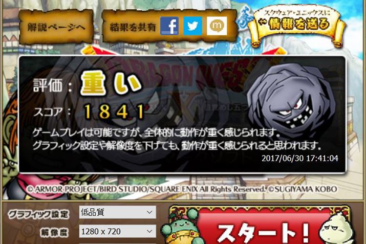 このサイズ感でゲームをプレイすることはないと思われますが、「ドラゴンクエストX」のベンチマークソフトを試してみました。グラフィック設定を低画質にしてテストしたところ、スコアは1841で、 “重い”という評価に