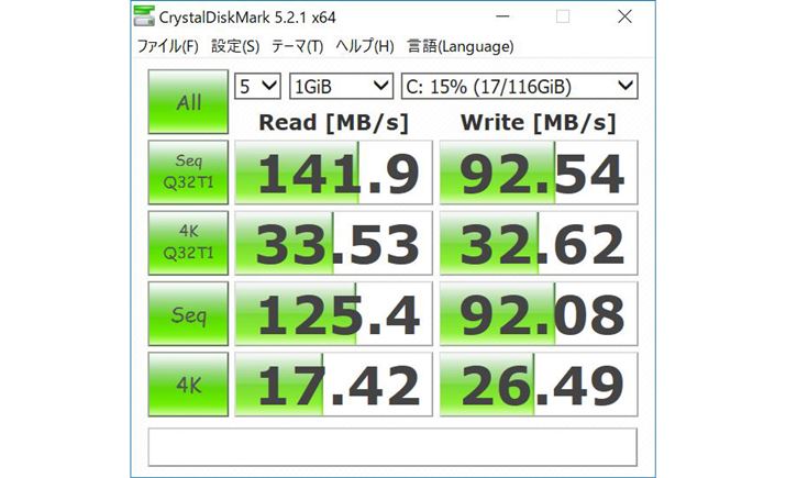 ストレージのスピードを測定するベンチマークソフト「CrystalDiskMark 5.2.1」(ひよひよ氏作)の結果は上記の通り。読み込みおよび書き込みも速いとは言えない結果でした