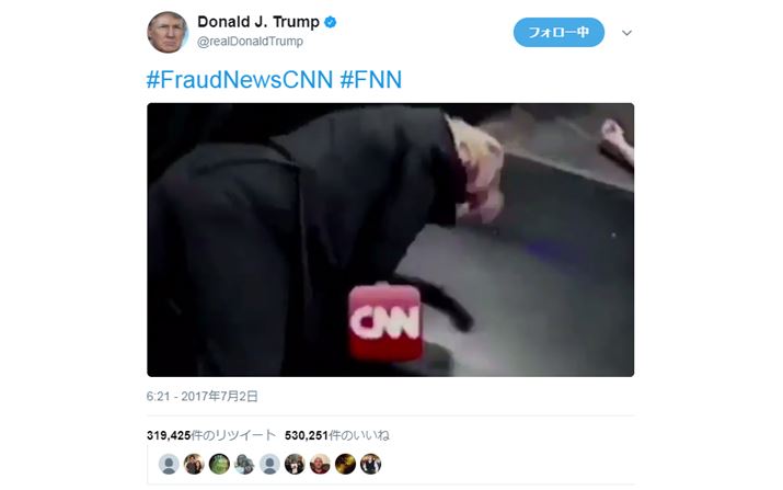 この件から約1週間後の7月2日、トランプ大統領がCNNのロゴを貼り付けた男性を殴り飛ばすという動画をツイート。動画は、トランプ大統領が2007年にWWEのプロレスに参戦したときの試合を加工した映像で、もともとは掲示板「Reddit」のオルタナ右翼のスレッドに投稿されたもの。これをトランプ大統領が「#FraudNewsCNN」(偽ニュースCNN)というハッシュタグとともにツイートし、大きな話題になったというわけです。