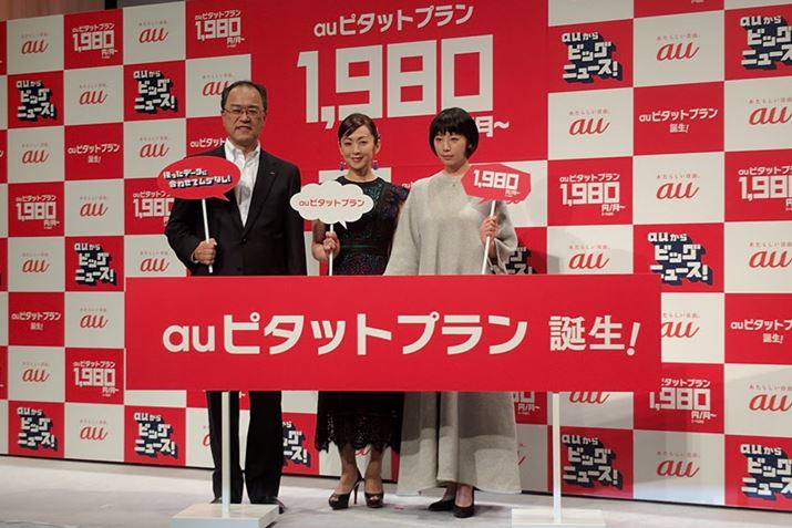 7月10日に行われた発表会には、KDDIの田中孝司社長(写真左)とともに、auのテレビCMで親子を演じる女優の斉藤由貴さん(写真中央)と夏帆さん(写真右)が登場
