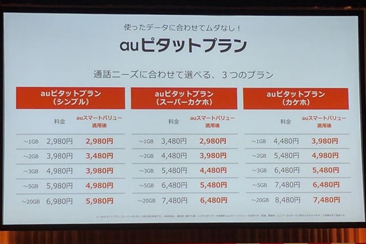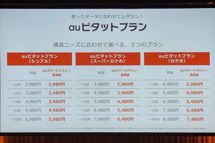 auピタットプランは、音声通話料金の違いにより3系統に分かれている。最安は「シンプル」と「スーパーカケホ」を組み合わせた場合で2,980円から、「カケホ」と組み合わせた場合は3,980円からとなっている