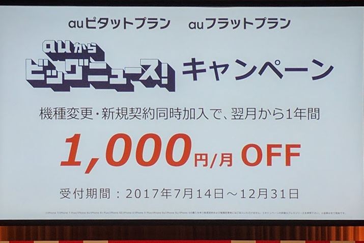 なお、「auピタットプラン」の開始にともなうキャンペーン「ビッグニュースキャンペーン」が、2017年7月14日〜12月31日の期間で実施される。このキャンペーン期間中に「auピタットプラン」に加入すると利用料金が、12か月間1,000円割引されるので、月額で1,980円からという料金で「auピタットプラン」が利用可能となる。固定回線とセットで割引される「auスマートバリュー」の割引額については条件によって異なり、永年で月額500円、または1,000円の割引が適用される(ただし「auピタットプラン(シンプル)」で、月間1GBまでの通信に限っては、割引が適用されない)。