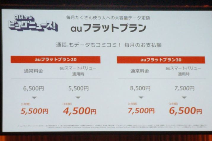 各プランに「カケホ」「スーパーカケホ」「シンプル」という音声通話料金の違いによる3種類のバリエーションが設定されており、最安の「シンプル」の場合、月間20GBの「auフラットプラン 20」で月額6,000円、月間30GBの「auフラットプラン30 」なら月額8,000円からという料金となる。なお、「auフラットプラン」も、上記の「auピタットプラン」と同様に、端末の割引である「毎月割」が利用できず、「アップグレードプログラム EX」を利用する。また、当面、新規契約および機種変更でiPhoneと組み合わせることができない。