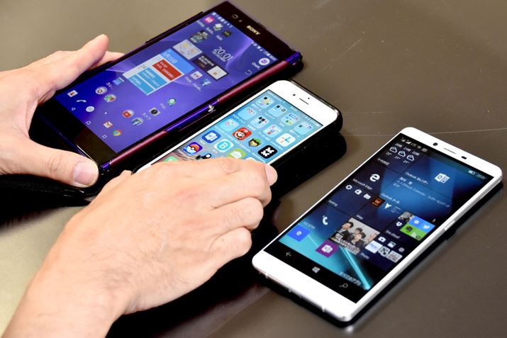 現在、伊藤氏が使っているスマートフォンは左から、「Xperia Z Ultra」(ソニーモバイルコミュニケーションズ)、「iPhone 6s」(アップル)、「MADOSMA Q601」(マウスコンピューター)。All About Japanスマートフォンガイドでもある伊藤氏の“源流”になったPDAとは?