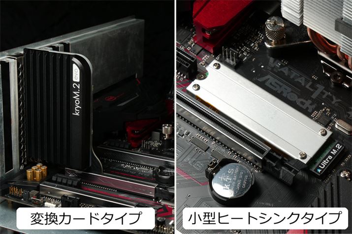 左がいったん変換カード上にM.2 SDDをマウントしてから大型ヒートシンクを搭載するタイプで、右が基板の上に小型ヒートシンクを搭載するタイプ。変換カードを経由しても速度はほぼ変わらない