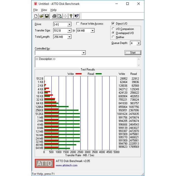ATTO Disk Benchmark 3.05の設定画面。転送サイズは512Bから64MB。Total lengthは256MBで計測している。なお、48MBと64MBのみやや転送速度が落ち込む傾向となったが、512KB以降は公称値通りの性能を発揮していた