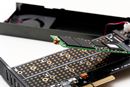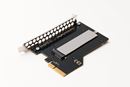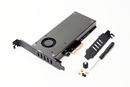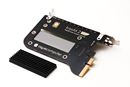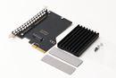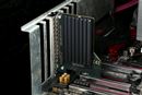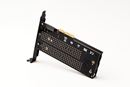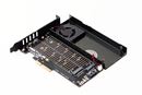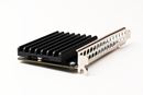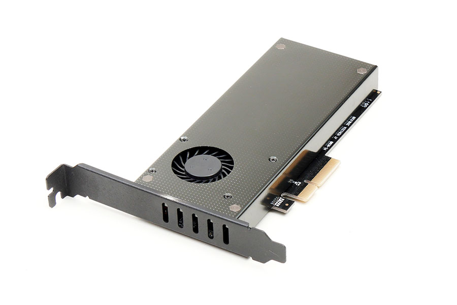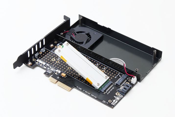 デュアルM.2スロットを備える一風変わったモデル。M.2スロットは、いっぽうがPCI Express x4接続を、もういっぽうがSATA接続をサポートする。インターフェイスの異なるM.2 SSDを2枚同時使用できるうえ、冷却も行えるのが特徴だ。基板は細長だがロープロファイルサイズに対応しているので、小型PCへ装着できる。冷却機構は約40mmのブローファン1基で、ブラケット側に搭載されている。外の空気も吸い込みつつチップに風を送ることで冷却するものだ。今回紹介する製品の中では唯一、ヒートシンクを使わないファンのみの冷却による製品となっている。