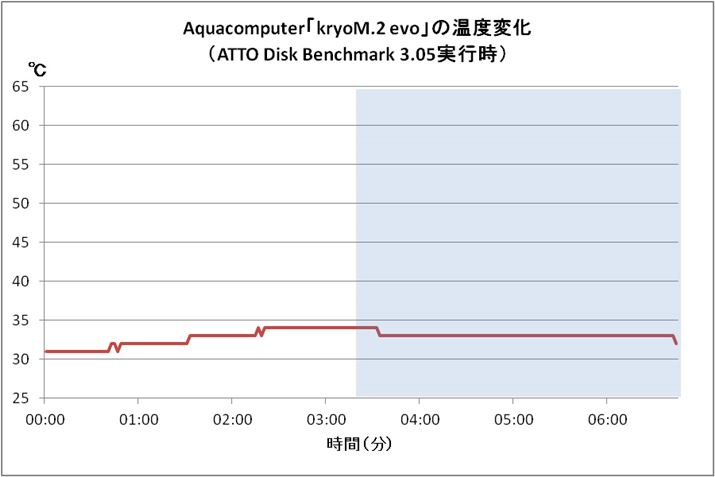 テスト終了後約6分かけてアイドル時の温度に戻った(ブルーの網掛け部分)。全体的に温度変化はゆるやかだ