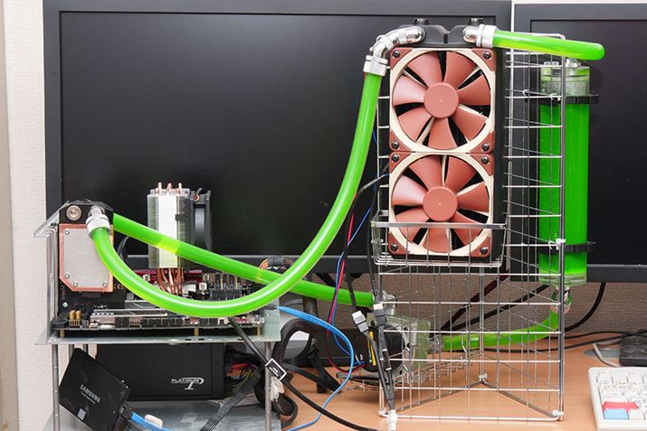 使用した水冷パーツは次の通り。ラジエーター:Hardware Labs「Black Ice SR-1 240」、リザーバー:BitsPower「Water Tank Z-Multi 250」(型番:BP-WTZM250AC-CL)、ポンプ:AquaComputer「D5」(型番:41091)、ファン:Noctua製120mm角×2個